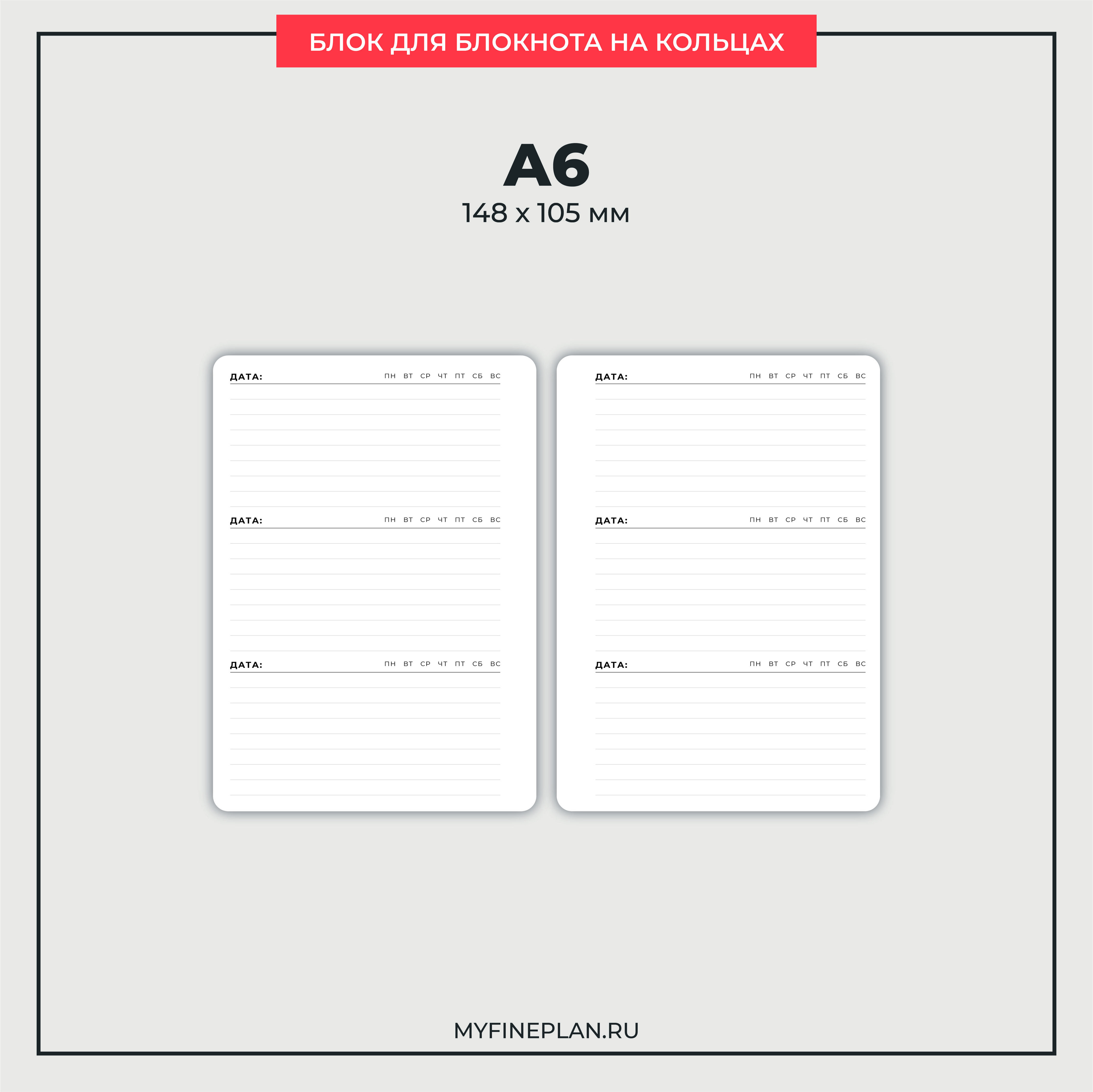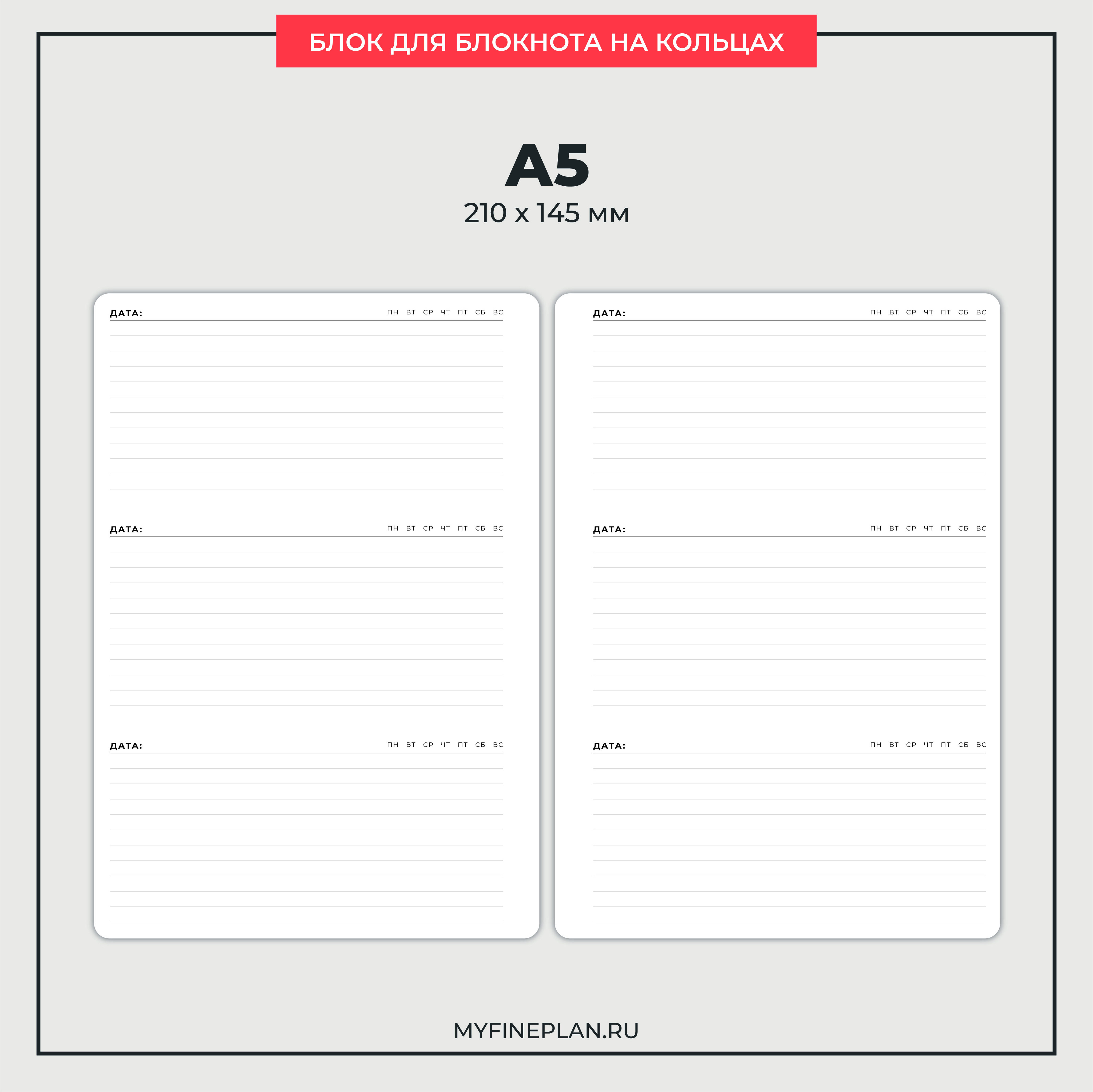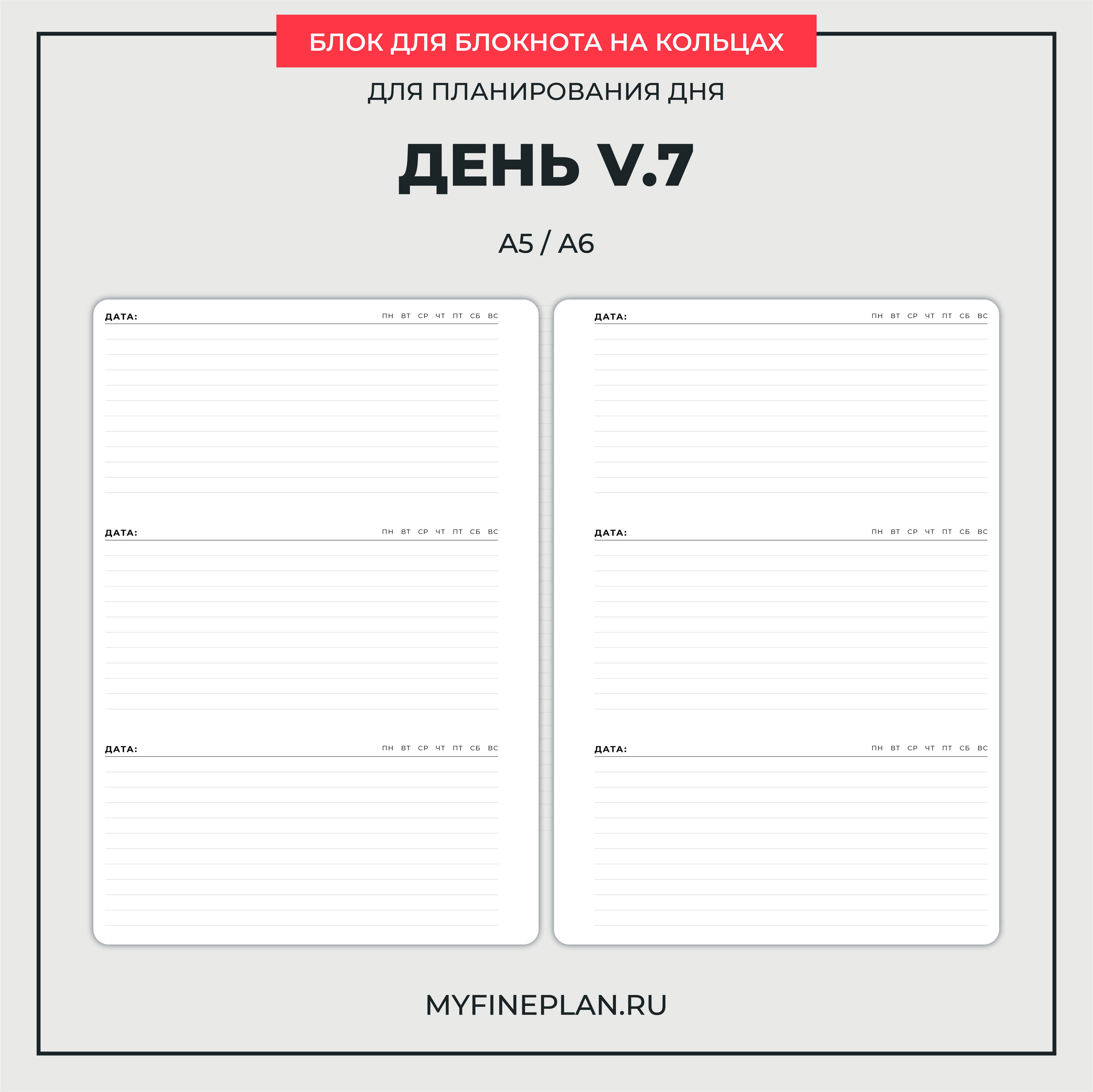 - Свободная область в линейку, которую можно использовать для планирования дня / подведения итогов дня / дневника успехов и достижений / дневника благодарности / дневника впечатлений и т.д.