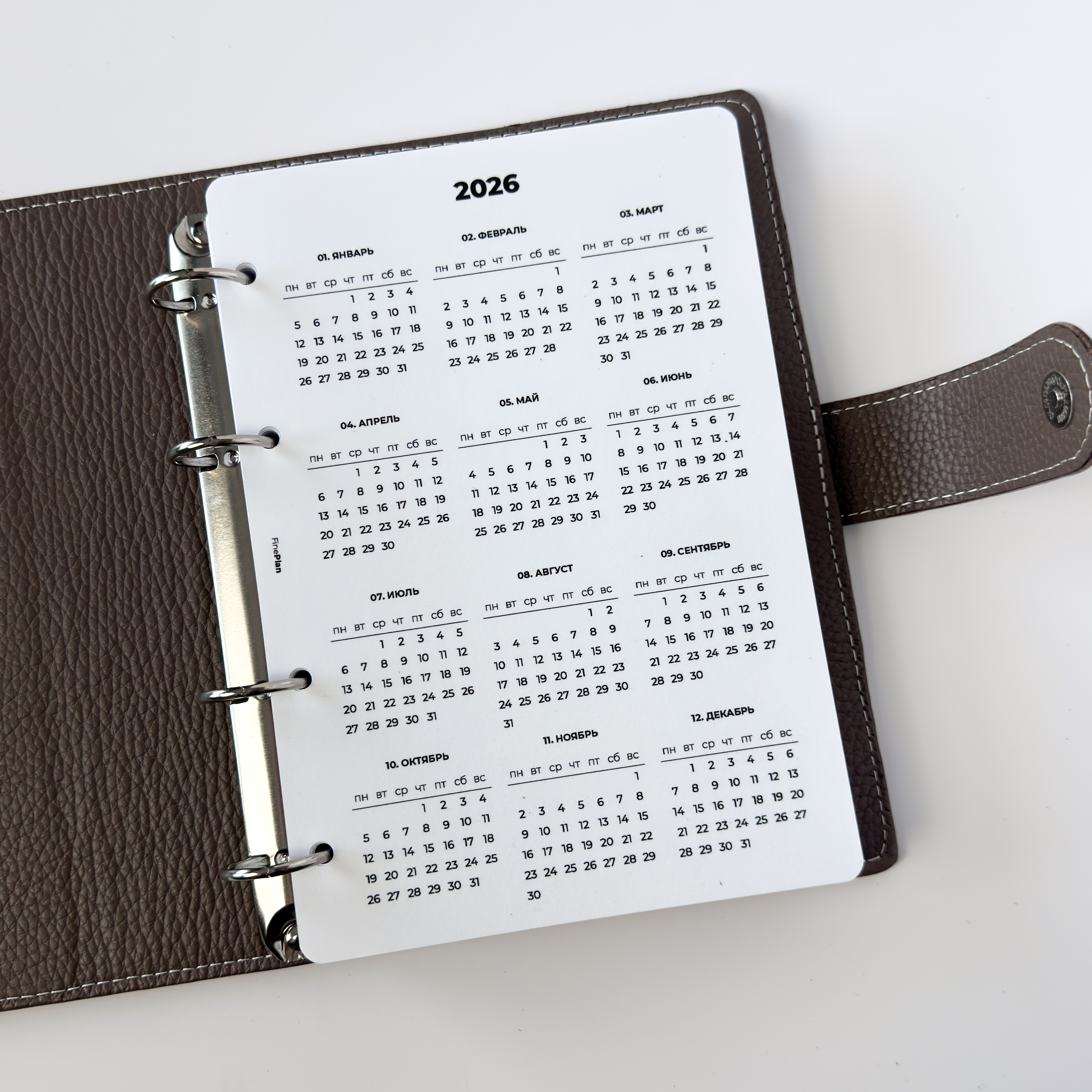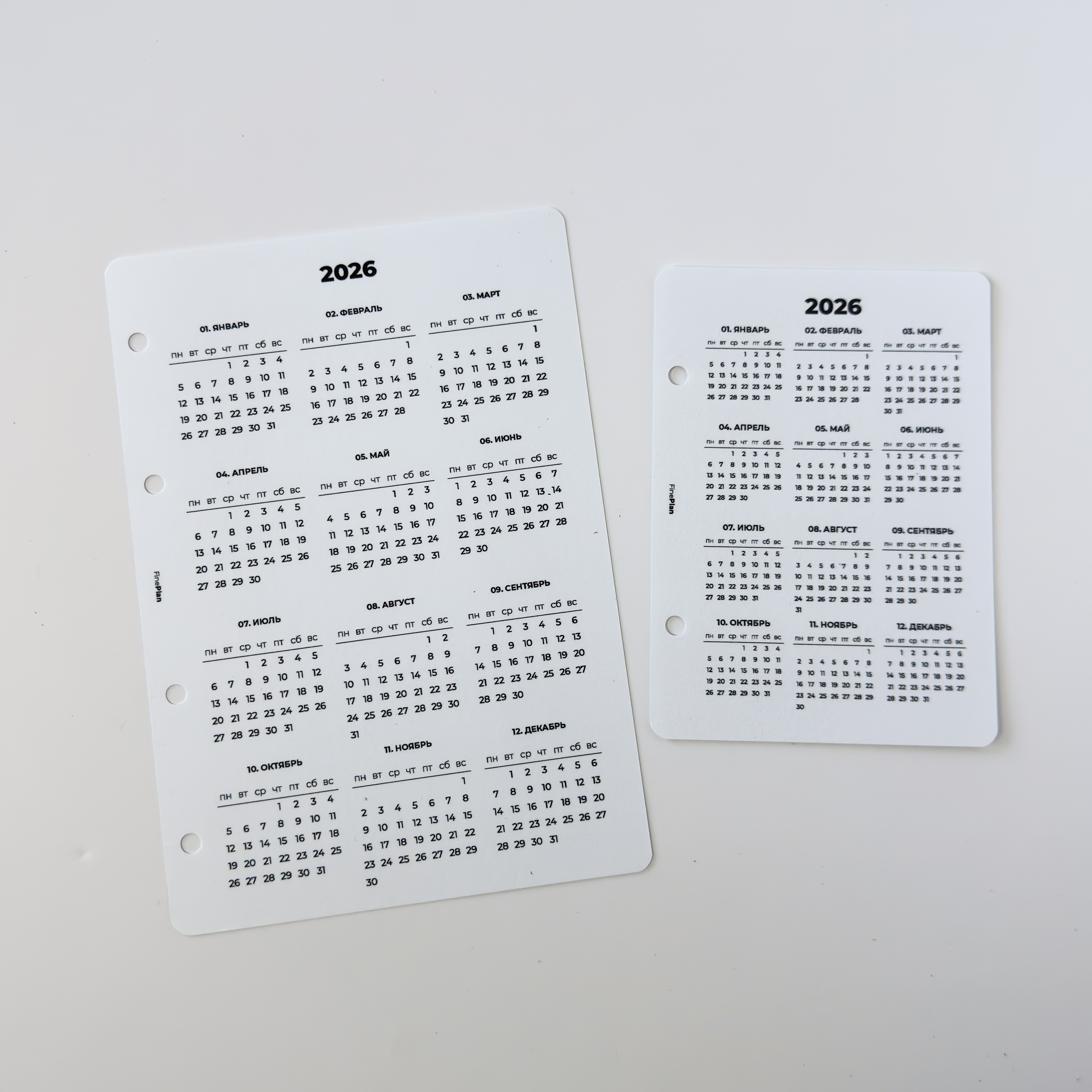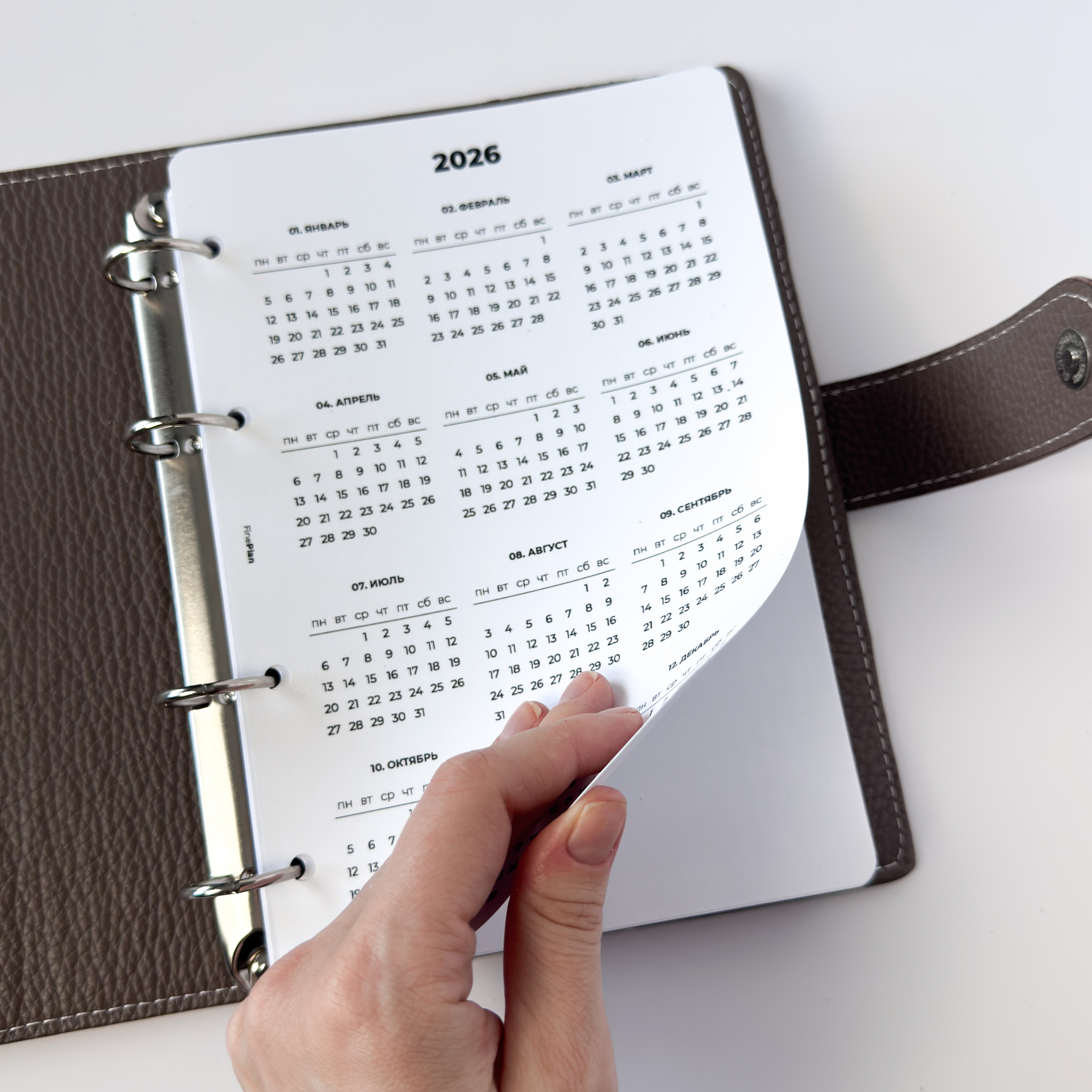 Надёжный и аккуратный помощник для планирования. Этот прочный разделитель с календарём удобно впишется в ваш блокнот — всегда под рукой, когда нужно свериться с датой.