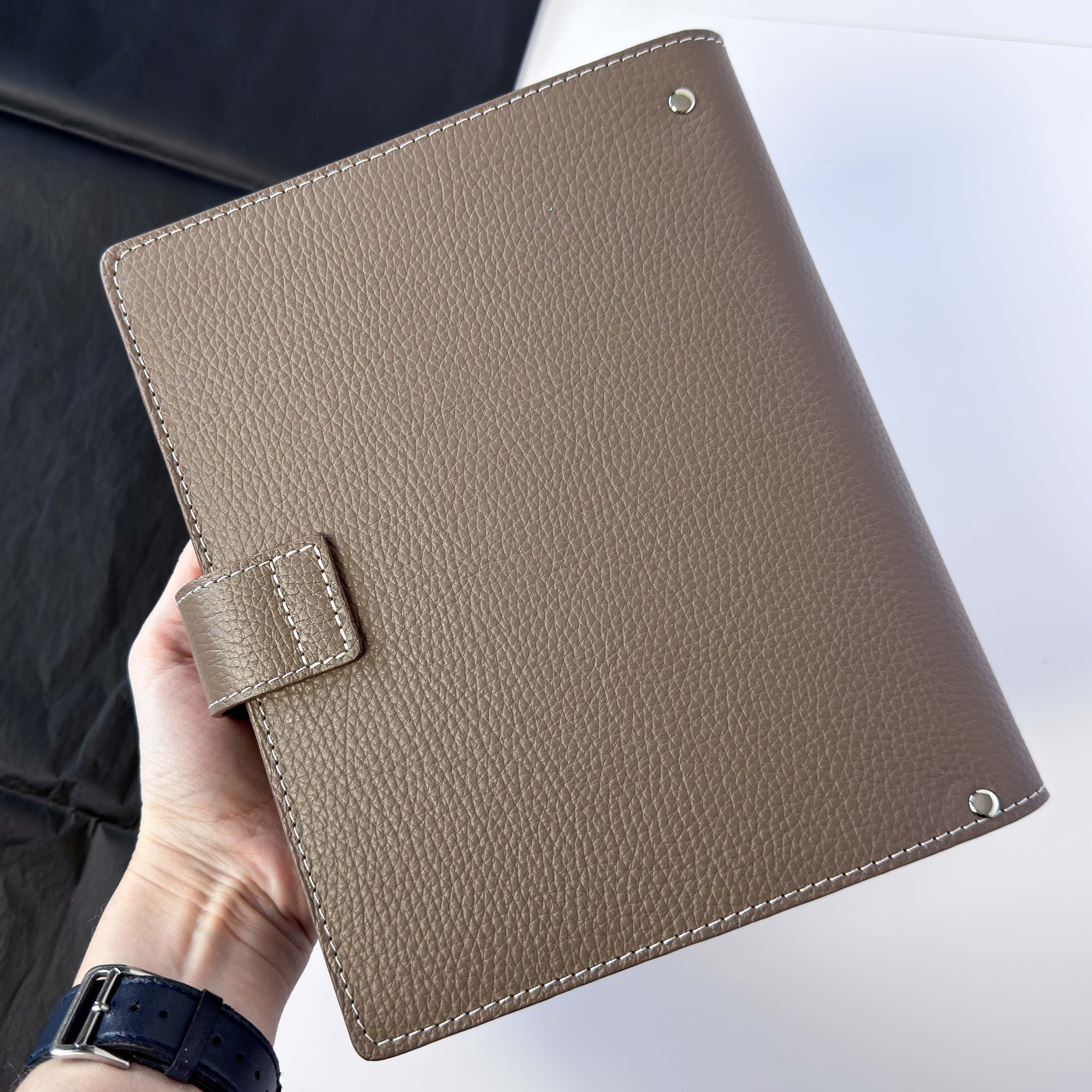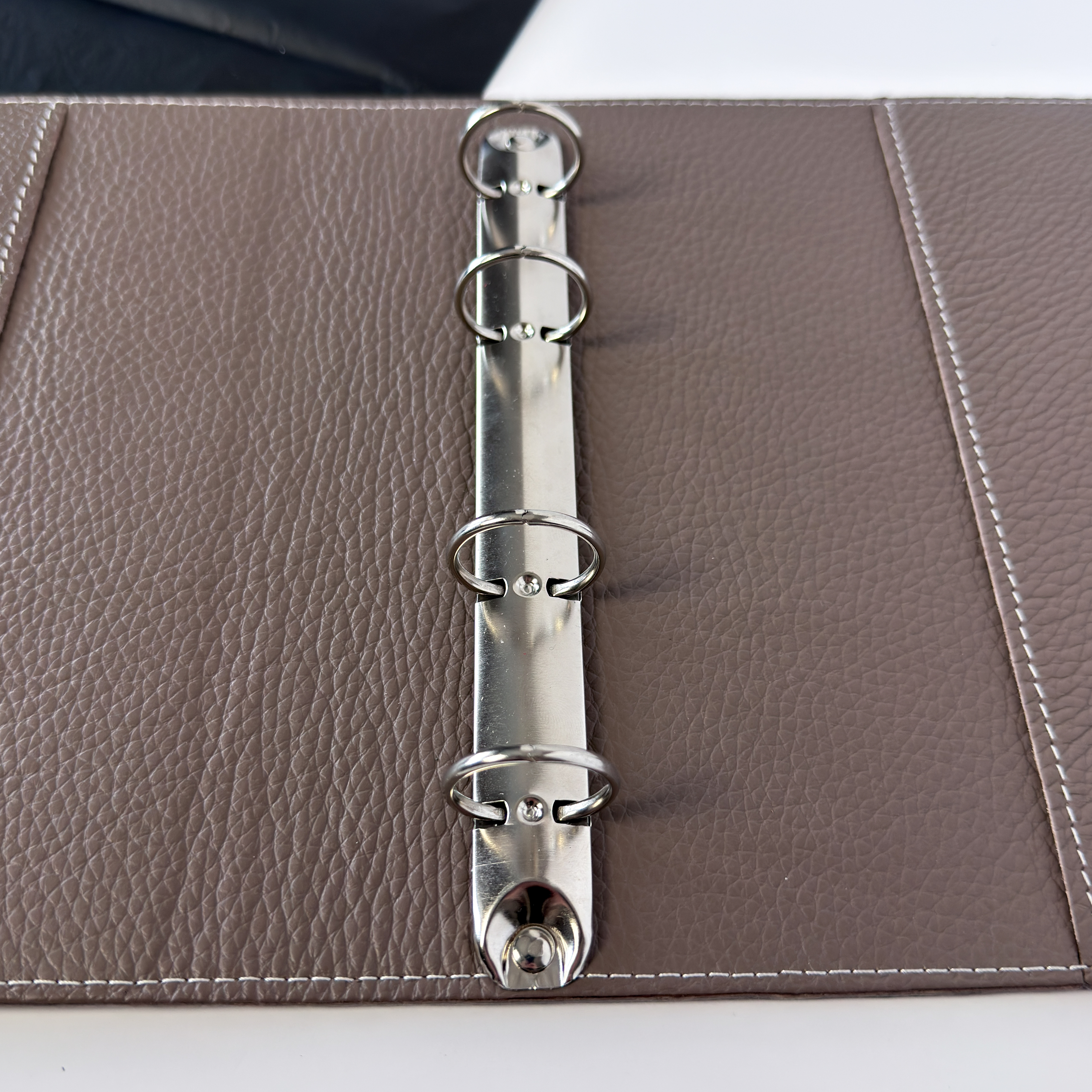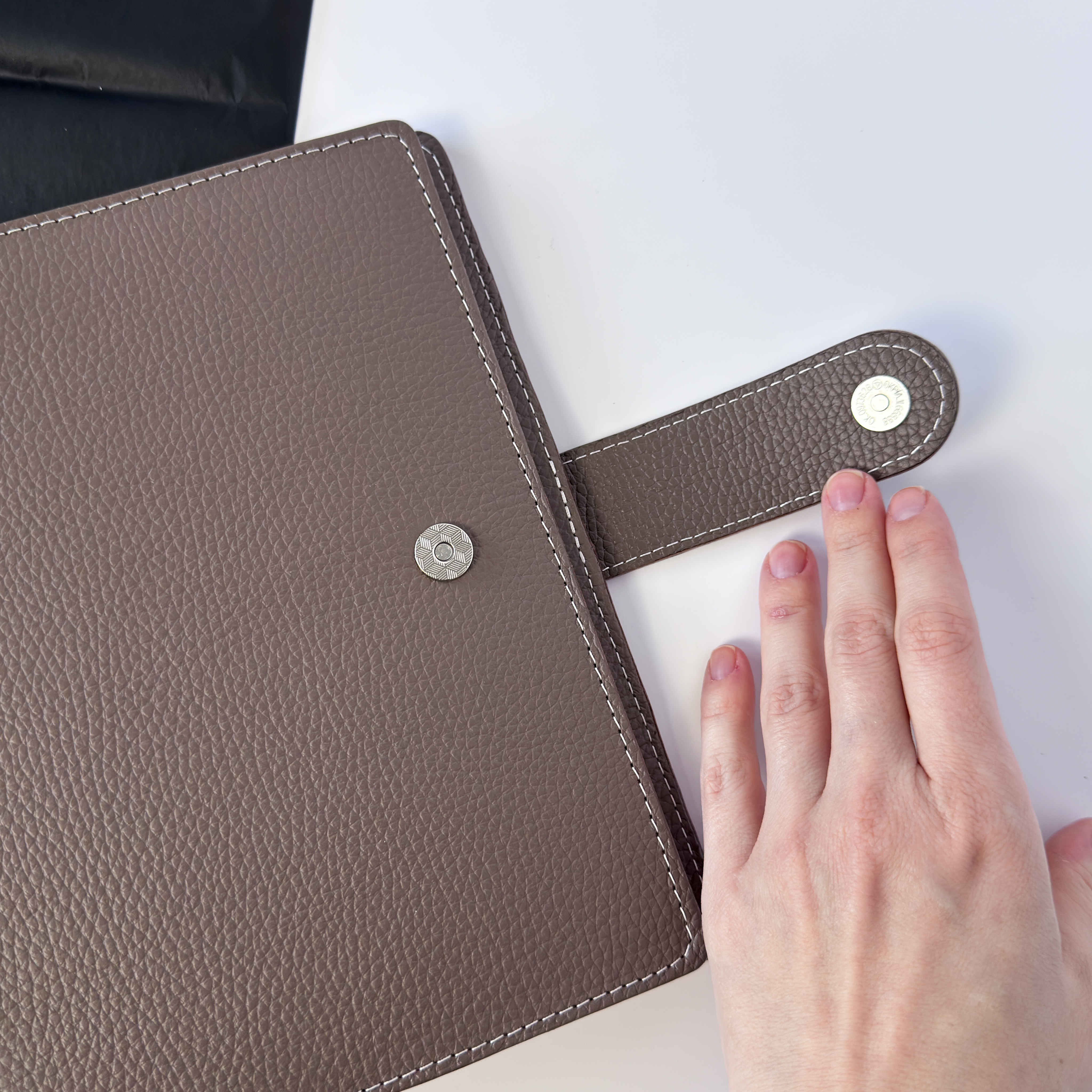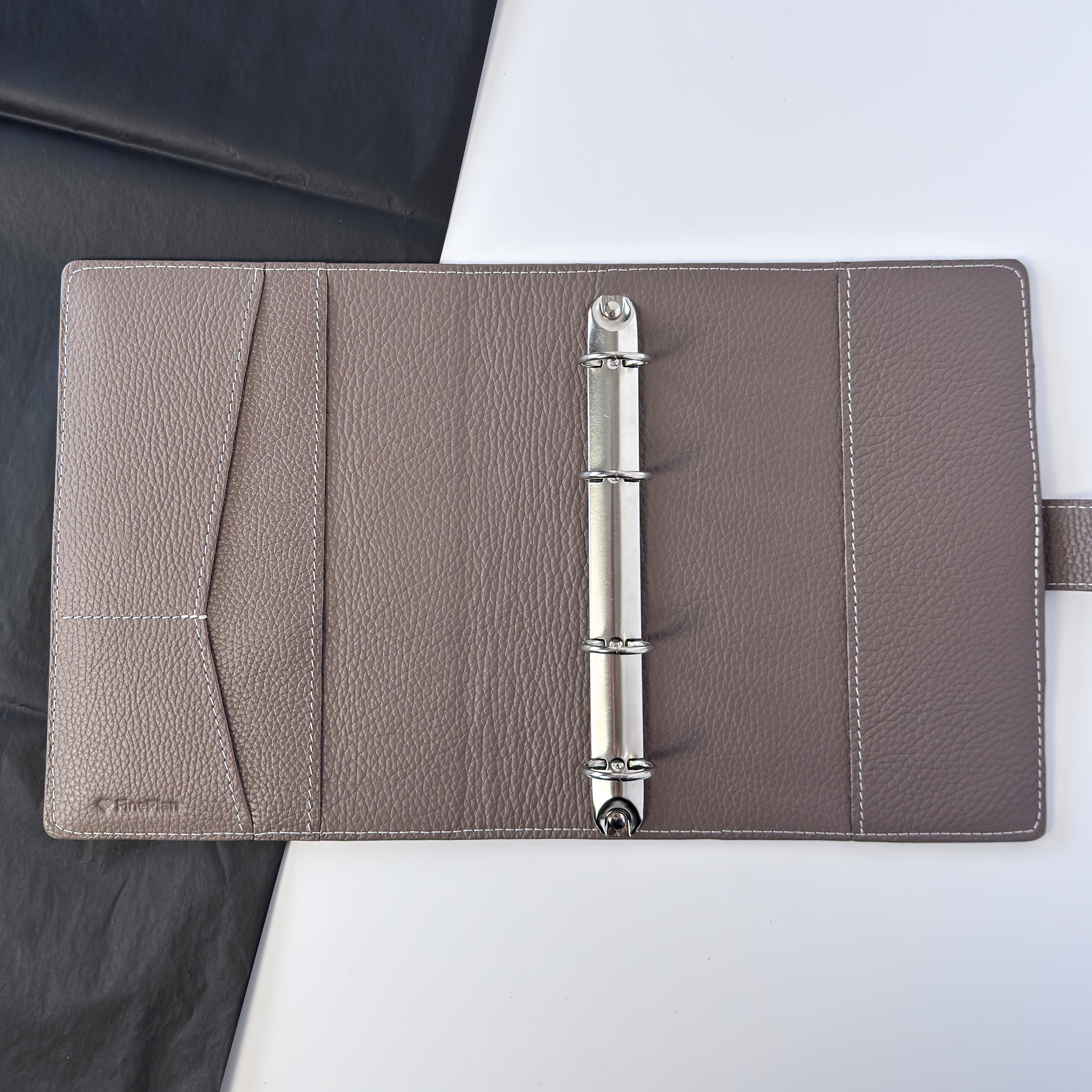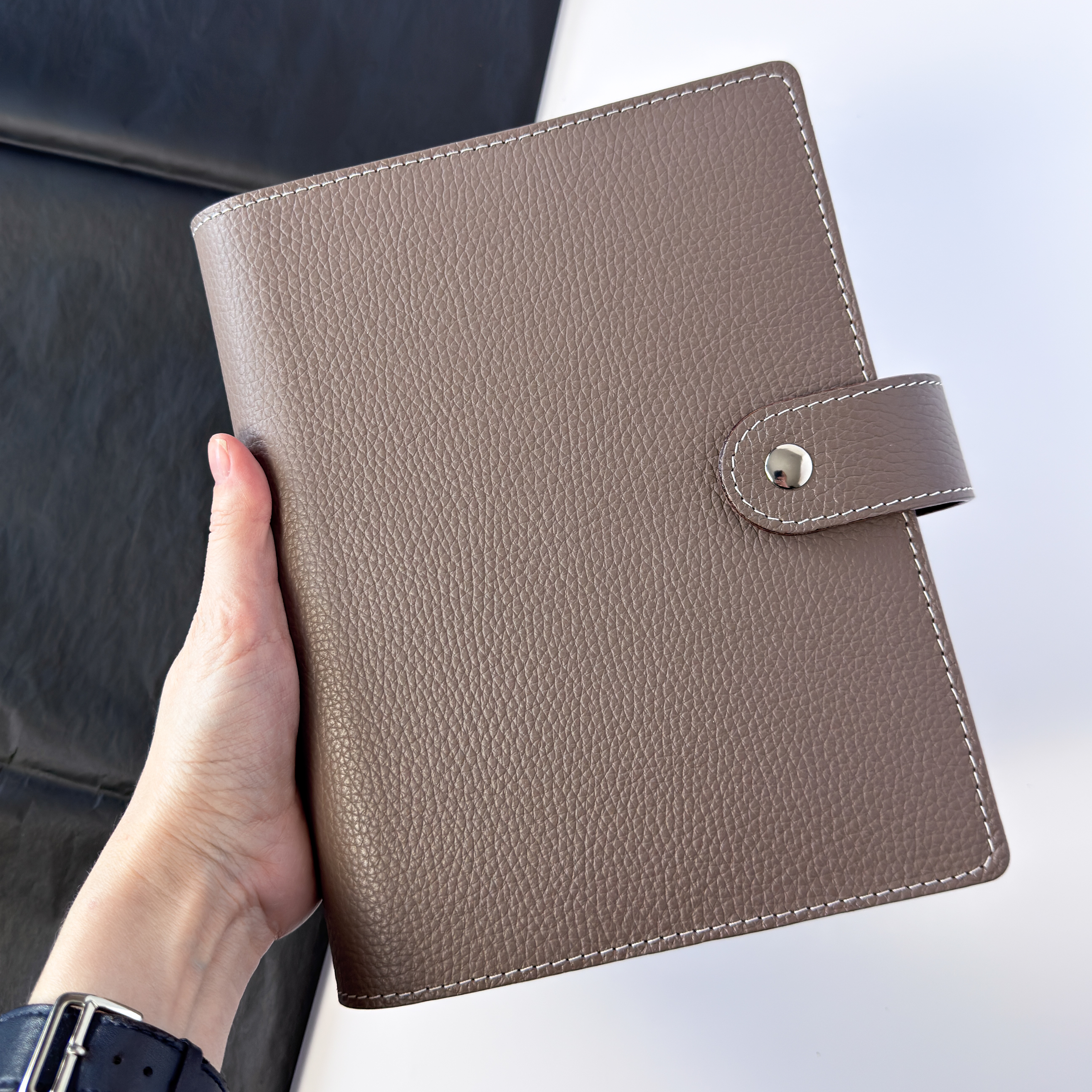 Формат A5 — один из самых универсальных: идеально подходит для подробного планирования, рабочих разворотов, записей и трекеров. Обложка рассчитана на сменные блоки на 4 кольцах, а хлястик удерживает всё внутри — аккуратно и надёжно.
