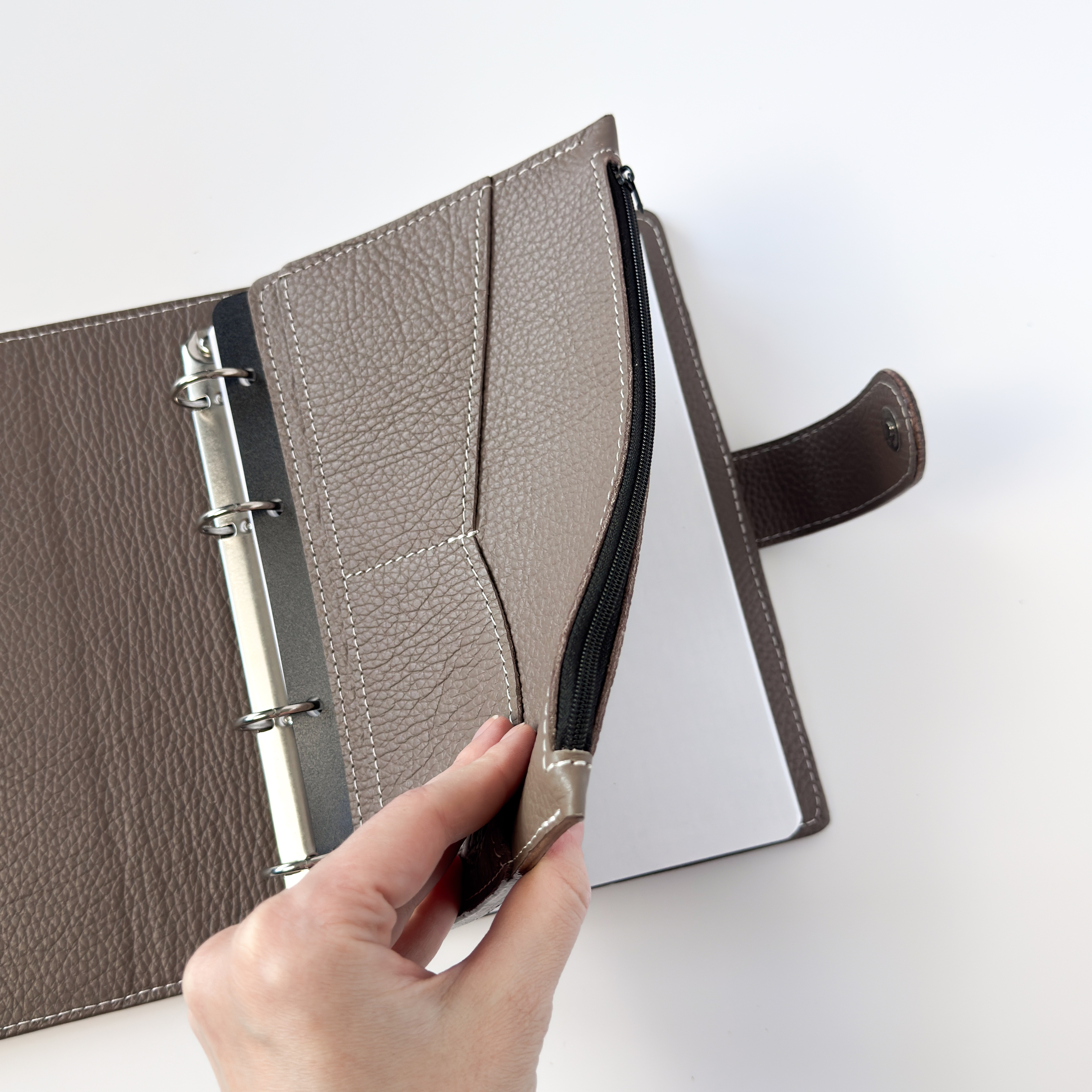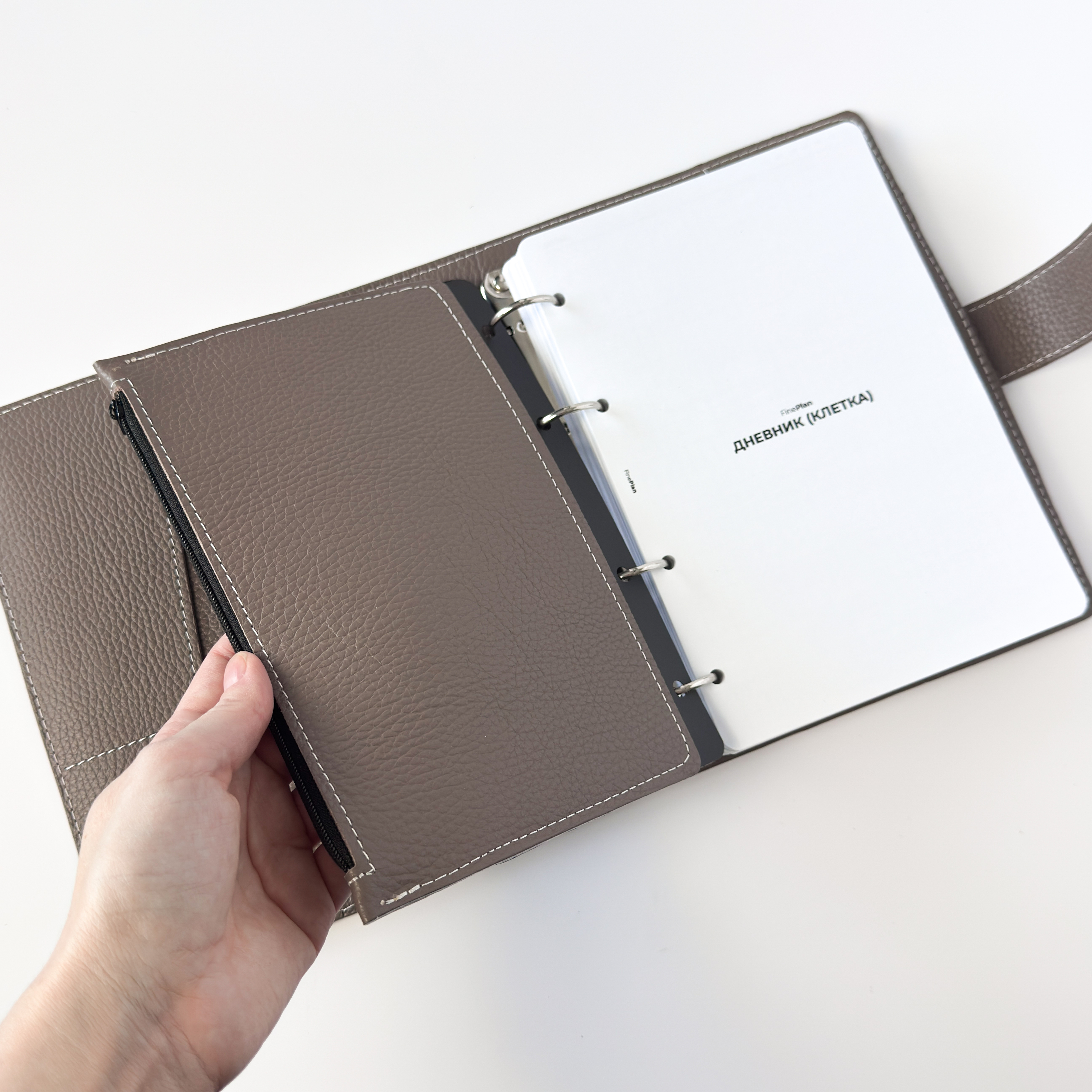 Вставка выполнена из мягкой кожи, с внешним карманом и отделением на молнии. Крепится на кольцевой механизм и легко переставляется в нужное место.